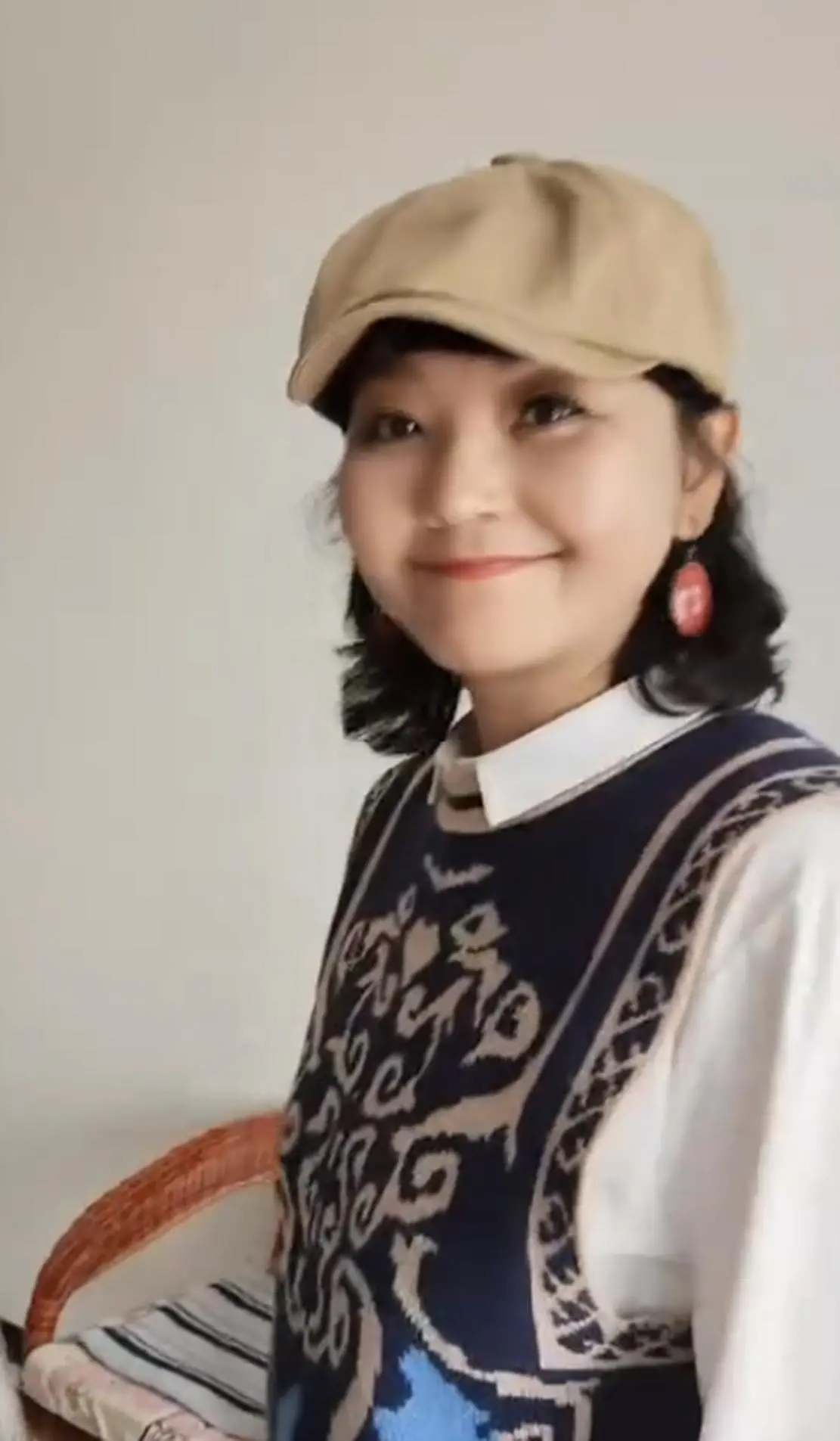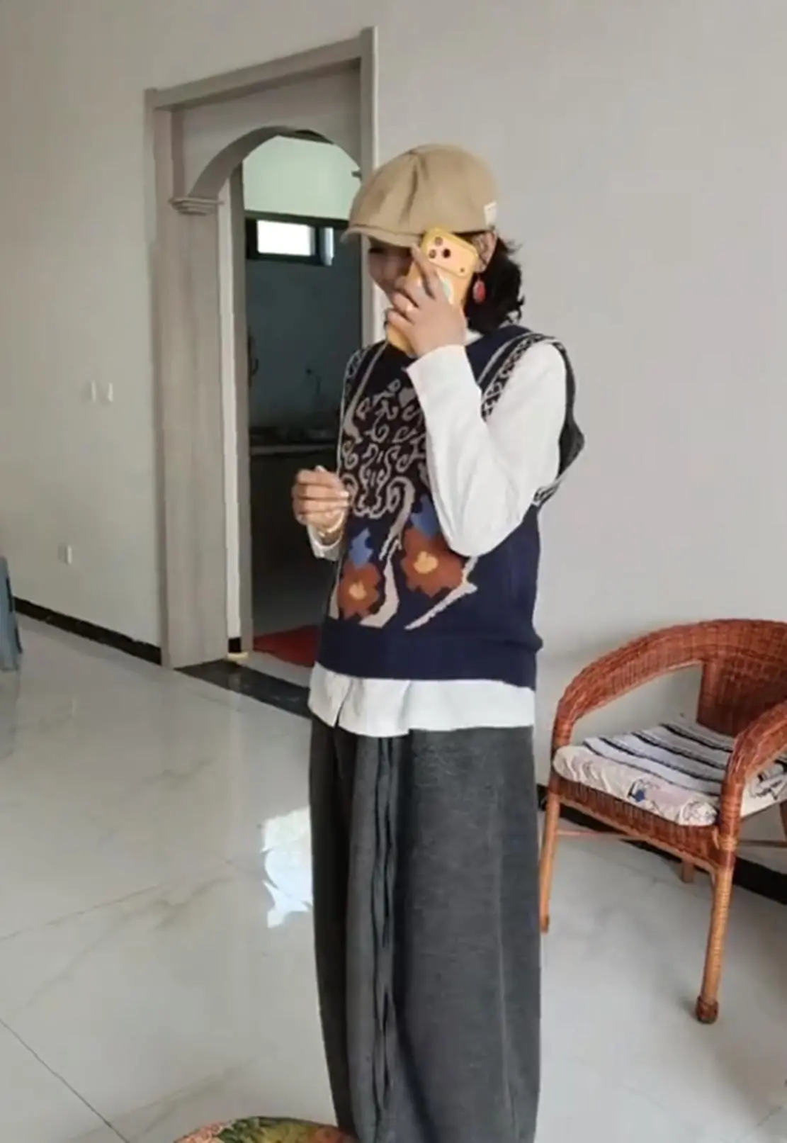 晒出的照片中,方琼穿着一身简单的白衬衫搭配藏蓝色针织马甲,下身套着阔腿裤,头上戴着一顶卡其色的鸭舌帽,一身穿搭可以说是很低调了。不过,作为村里的名人,方琼一现身还是有不少村民围了过来。