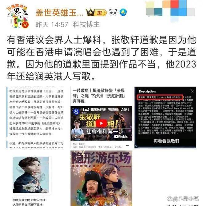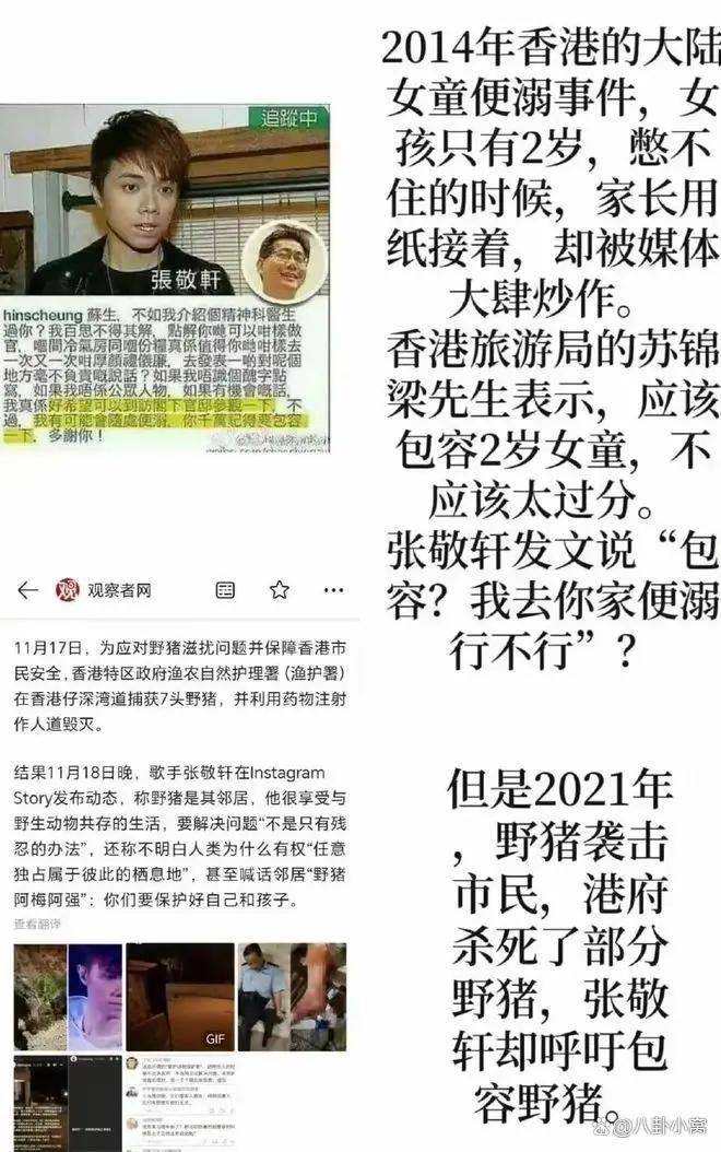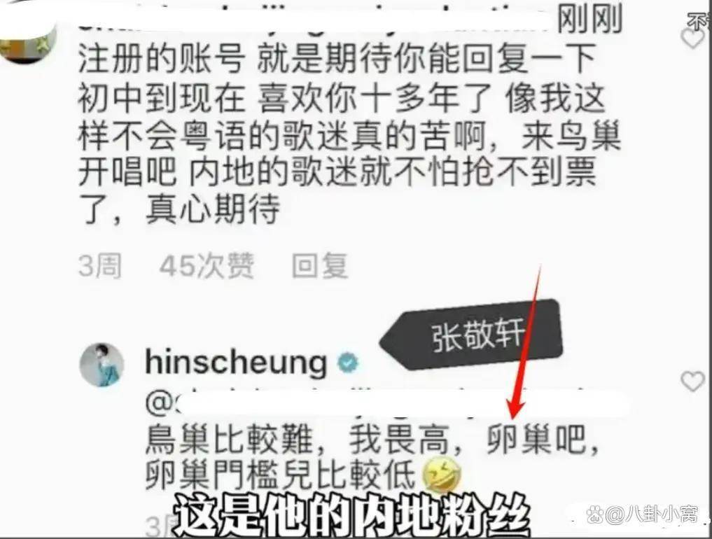 更让网友难以接受的是张敬轩对内地粉丝的态度。一位喜欢他多年的内地粉丝曾留言,希望他能来北京鸟巢开演唱会。张敬轩的回复却是:“鸟巢比较难,我畏高,卵巢吧,卵巢门槛比较低。”这句用女性生殖器官进行的低俗调侃,被广泛视为对内地粉丝情感和女性尊严的双重践踏。