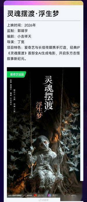 2026年4月20日,爱奇艺iJOY春季悦享会上的一则官宣,在影视圈投下了一枚重磅炸弹——经典国产志怪IP《灵魂摆渡》将推出首部全AI生成电影《浮生梦》,定档2026年暑期档