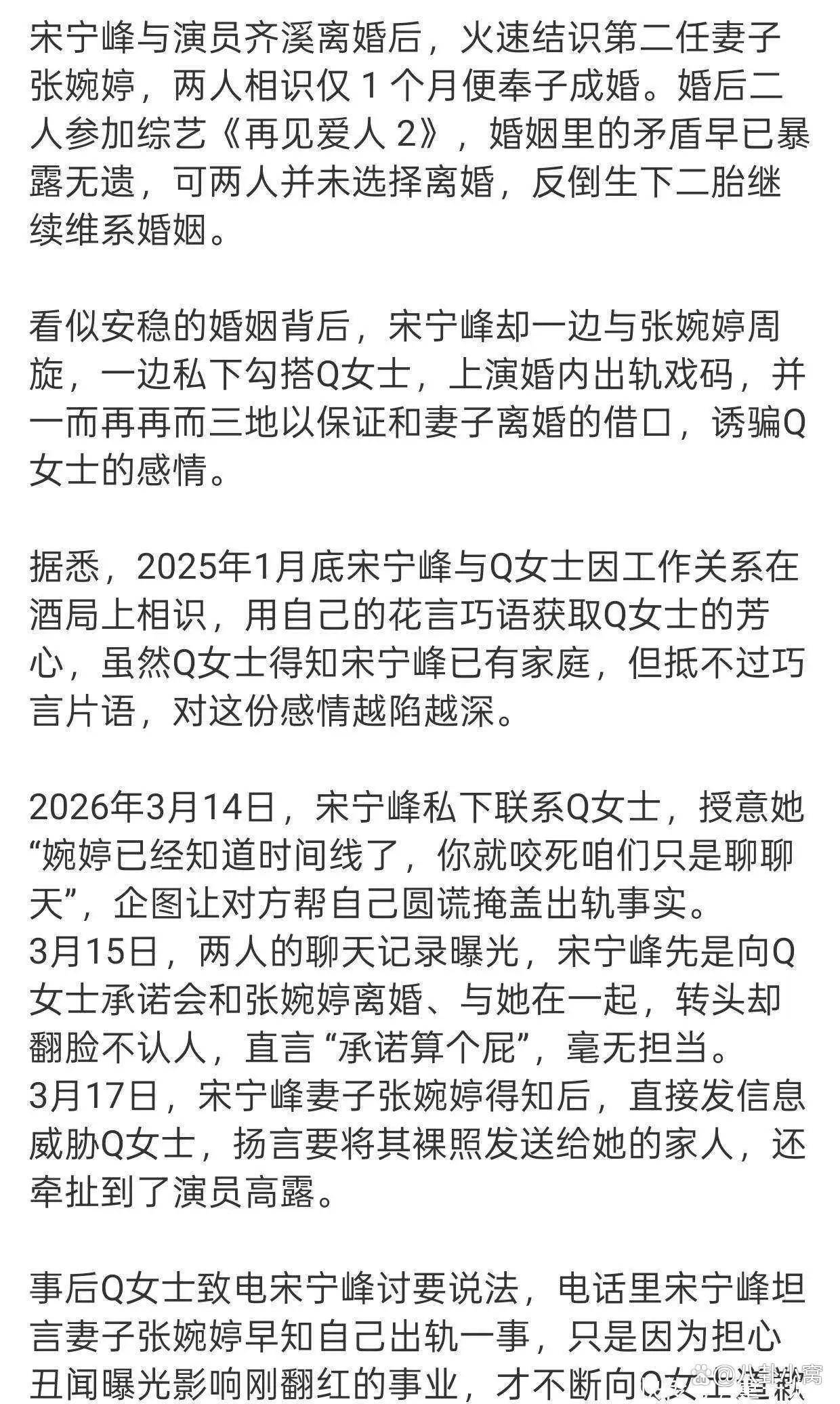 2026年4月,娱乐圈再次上演了一出令人瞠目结舌的婚姻闹剧。演员宋宁峰婚内出轨的丑闻尚未平息,其妻子张婉婷的一番操作却让整个事件出现了戏剧性反转。在丈夫出轨对象Q女士曝光的聊天记录中,张婉婷不仅没有以受害者姿态谴责第三者,反而主动向对方掏心掏肺,自曝了一段令人震惊的婚前黑历史——她曾介入他人婚姻,怀上孩子后被迫堕胎。