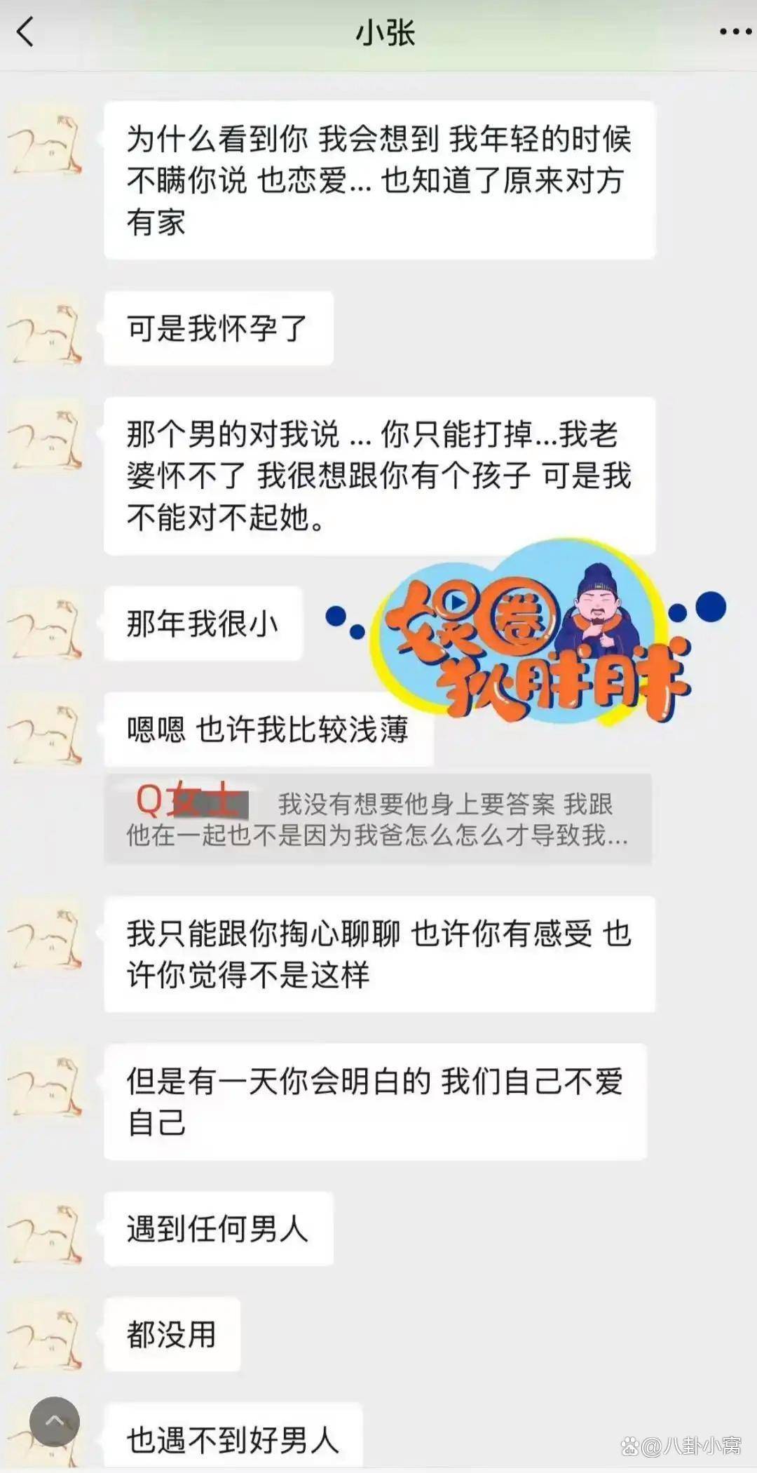 更引人注目的是细节的吻合。张婉婷在聊天中提到,那个男人曾对她说“老婆不能生孩子,我想跟你生孩子”。巧合的是,董璇曾在综艺节目中自曝生育困难,从2012年左右开始备孕,为备孕停工三年,2015年初第一胎没保住胎停,同年下半年才有了女儿酒窝。