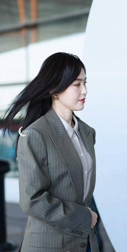 她当天穿着一身剪裁得体的深色西装外套,下身搭配修身长裤,脚上踩着一双细高跟鞋,一头黑长直发型配上斜刘海。