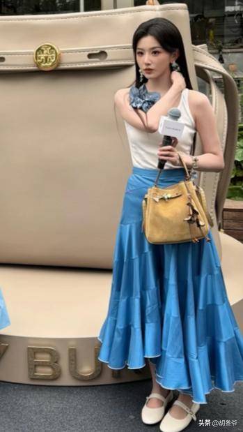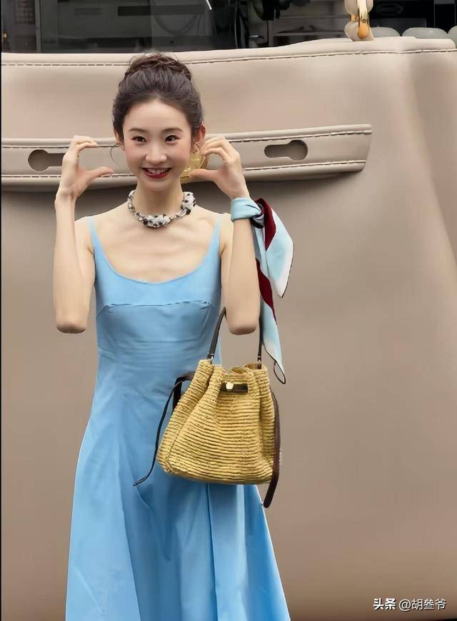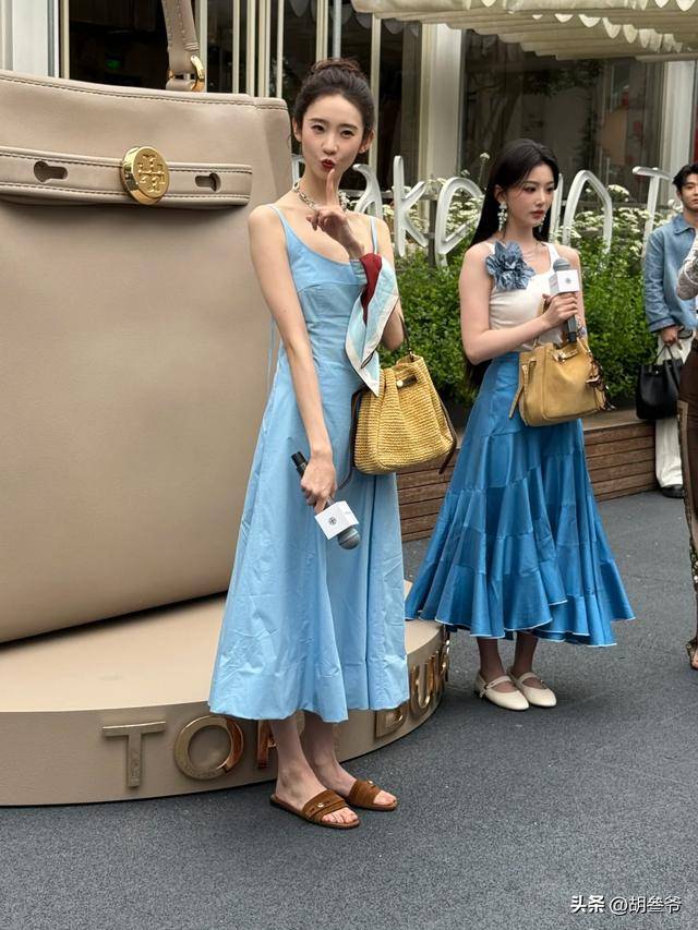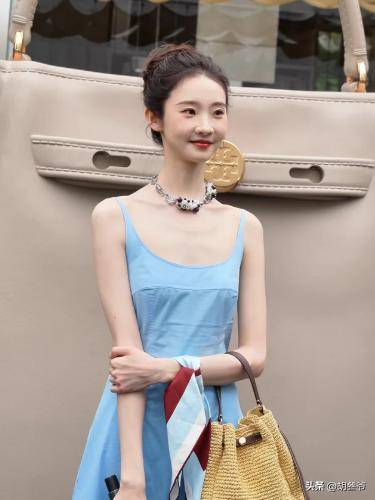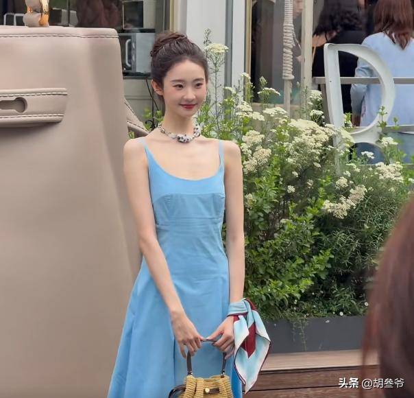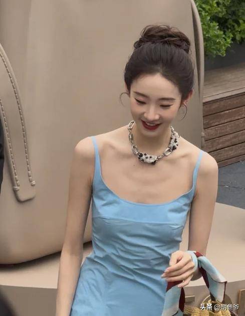 这次蓝色吊带裙贴身,把她过瘦的缺点无限放大,没有女性该有的柔美感,反而显得干瘪。