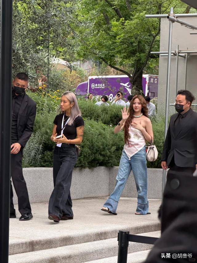 这次穿平底拖鞋,大概率也是为了迁就身边人,可牺牲了造型美感,实在有点得不偿失。