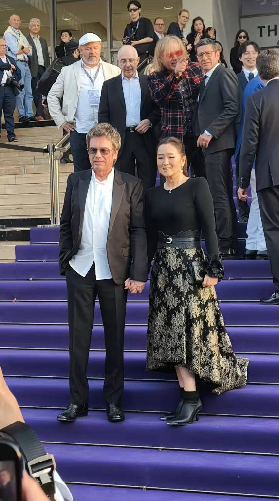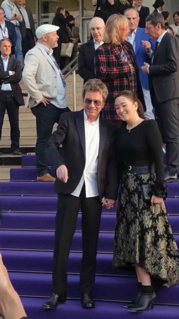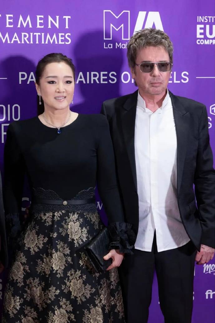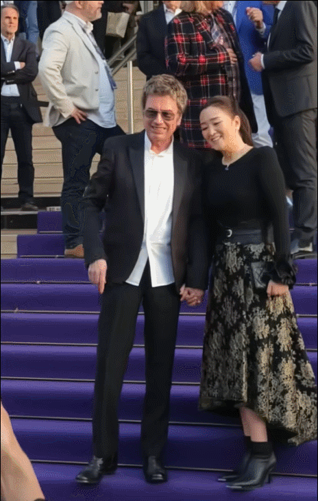 而比女王气场更抢镜的,是她与77岁丈夫让·米歇尔·雅尔的甜蜜互动。两人全程十指紧扣,面对外媒镜头毫不避讳。巩俐微微露出笑容,还特意将头偏向丈夫一侧,难得流露出小女人的依恋姿态。她的丈夫雅尔身着深色西装,身姿挺拔,两人并肩而立,亲昵互动尽显多年默契。