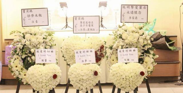 施明的前夫、老戏骨李家鼎以及两个儿子李泳汉、李泳豪的花牌,则放在灵堂正中间。不过,最中心的位置并非是李家鼎的花牌,而是大儿子李泳豪的花牌。