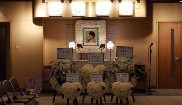 灵堂的正中央,悬挂着施明的遗照。照片中,施明化着精致的妆容,轻轻回眸一笑,非常令人怀念。