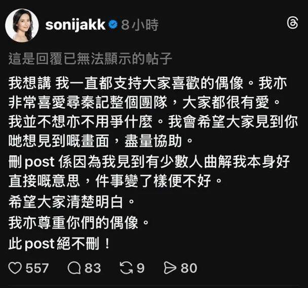 她解释自己之前之所以删掉帖文,是因为看到少数人曲解了她原本很直接的意思,令整件事变了样。随后她更表明,这一则帖文绝不会删,也会继续尊重大家喜欢的偶像。