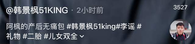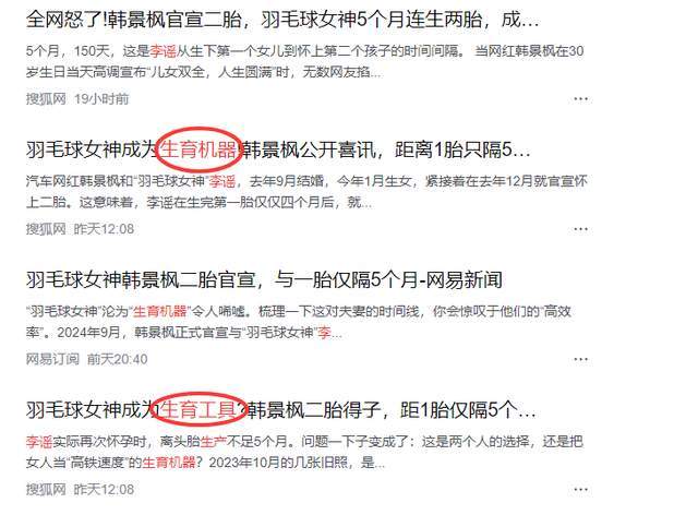 三天前,网红韩景枫与“羽毛球女神”李谣官宣生子,很多网友便以此为热度,撰写了一些不切实际的言语,包括第一胎与第二胎相隔只有五个月,由此称其为“生子机器”。