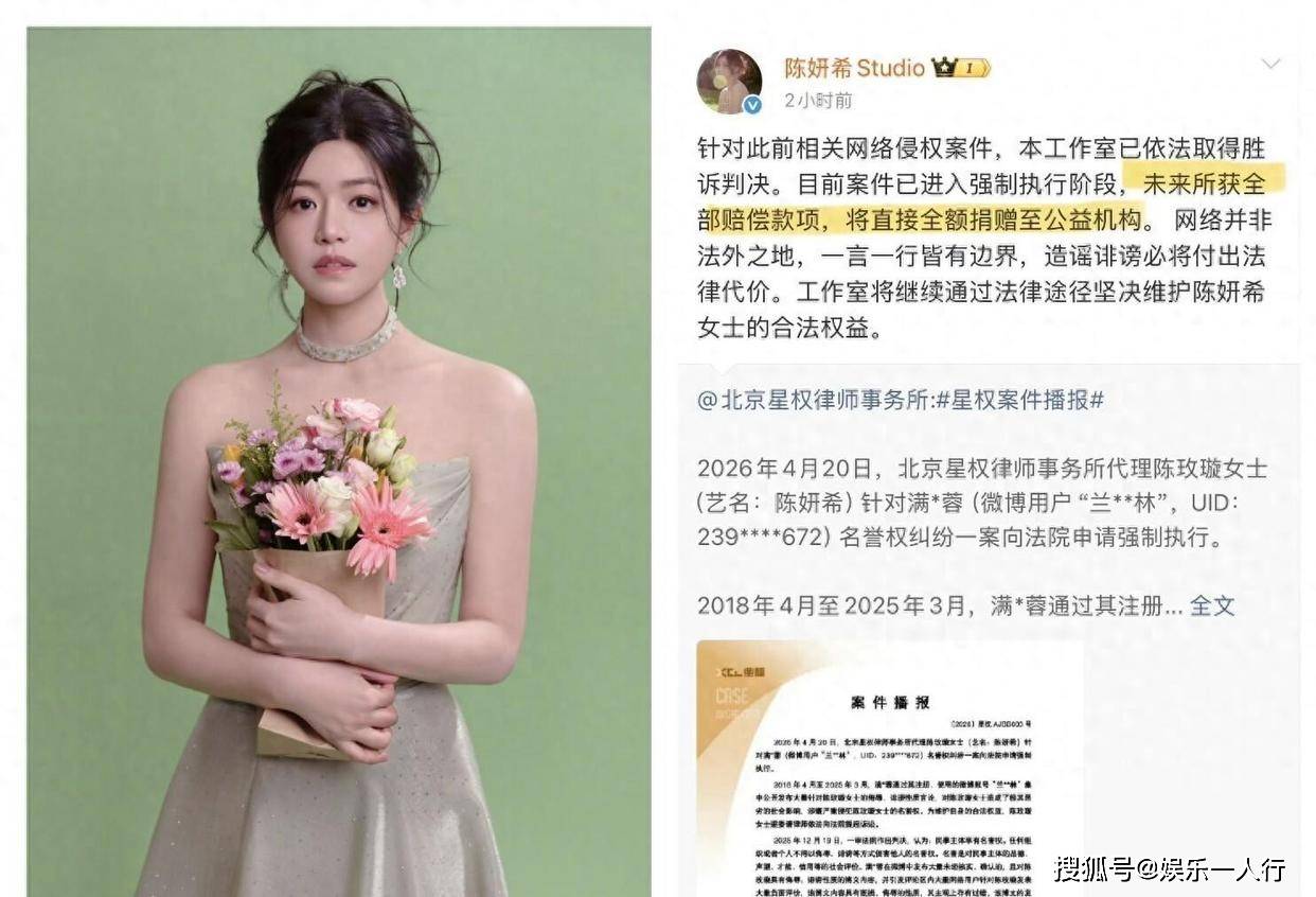 4月22日,律师事务所公开了案件播报。同一天,陈妍希工作室转发并回应,确认案件进入强制执行阶段。工作室还做了一个决定:未来执行到位的全部赔偿款项,将直接全额捐赠给公益机构。