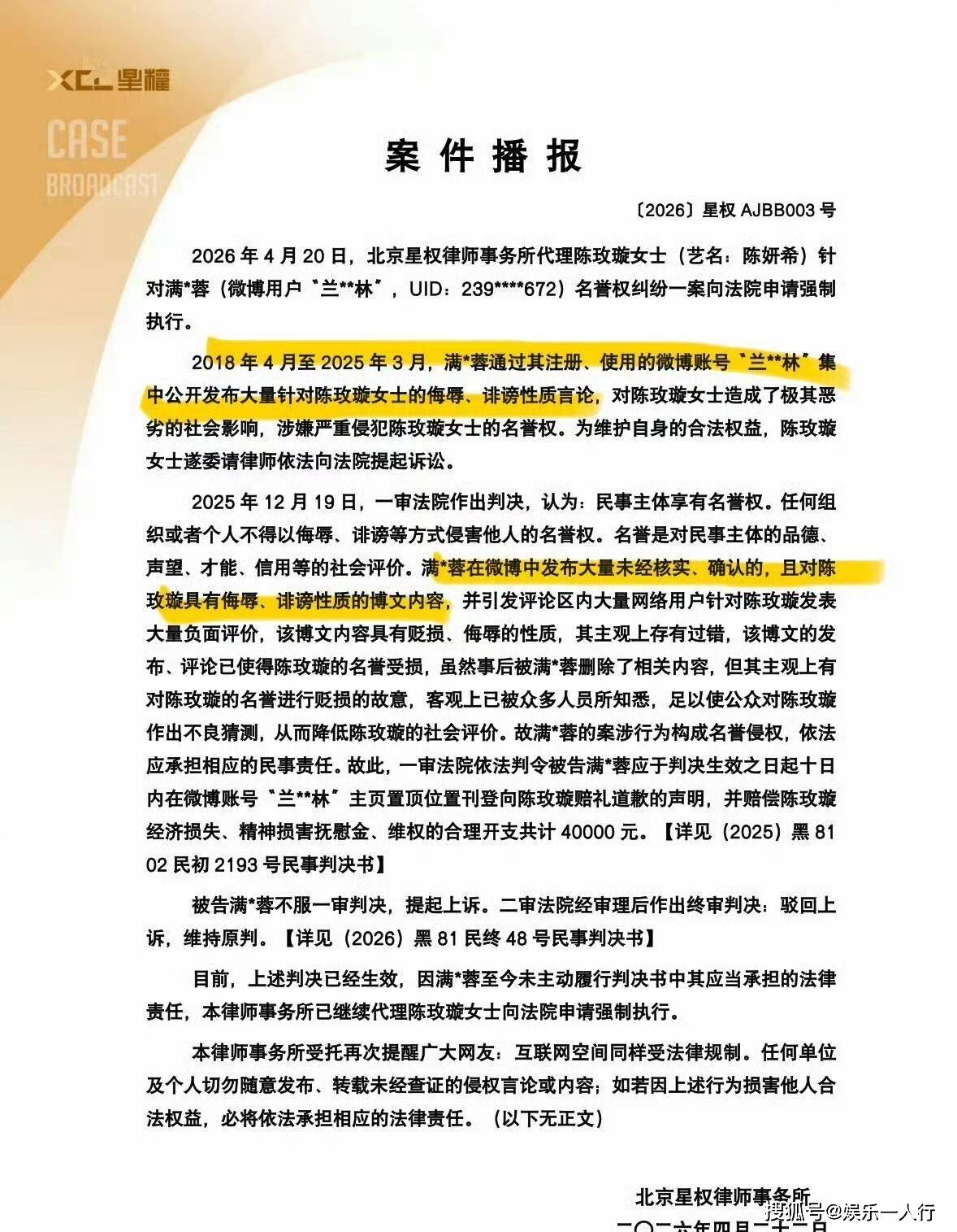 但判决生效后,被告没有主动履行。她没有在微博置顶道歉,也没有支付那4万元赔偿。于是,2026年4月20日,陈妍希方面通过北京星权律师事务所,向法院正式递交了强制执行申请。