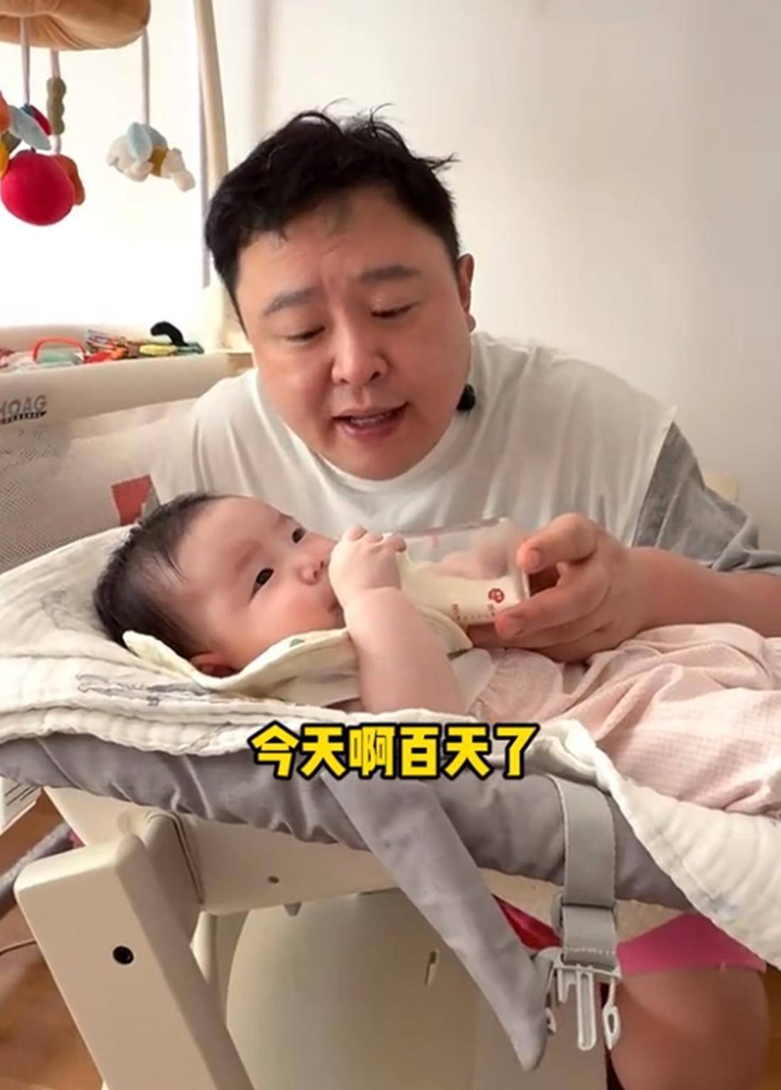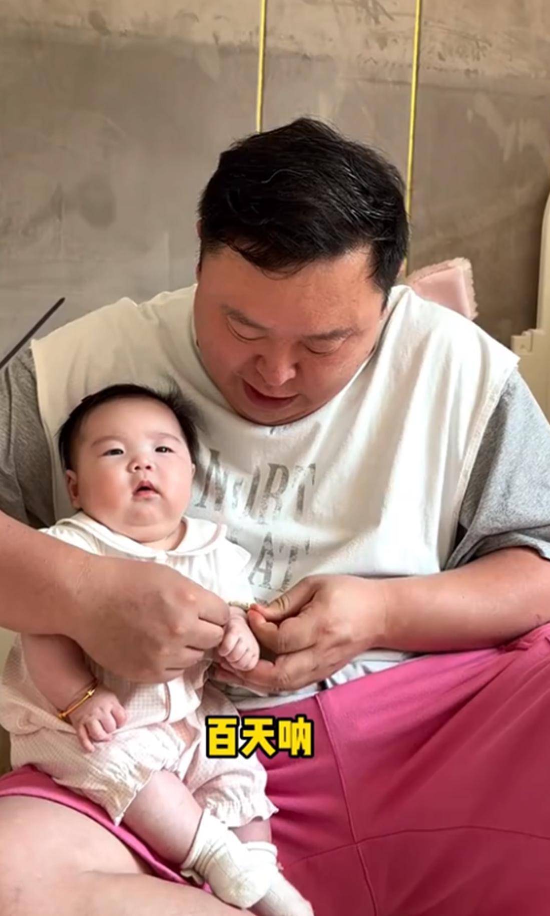 四月二十二日是女儿出生一百天的日子,这段视频拍得比较长,她戴着金锁和金镯子,穿着一件白色娃娃领的小衣服,躺在粉色的靠垫上,周围堆着不少毛绒玩具,爸爸拿着奶瓶喂她喝奶,手有点发抖,奶瓶的角度没放对,漏了一点奶在衣领上,他没有去擦,继续喂她,最后画面停在他轻声说了一句“百天啦”,声音很轻,好像怕把她吵醒似的。