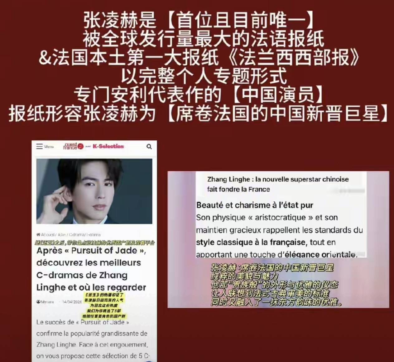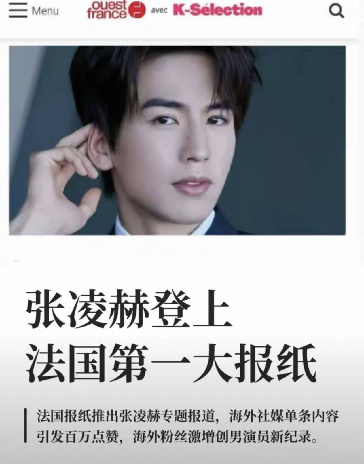 近期,张凌赫再迎重磅突破——登上法国发行量最大的《法兰西西部报》整版专题,成为该报创刊以来首位获此殊荣的中国演员。