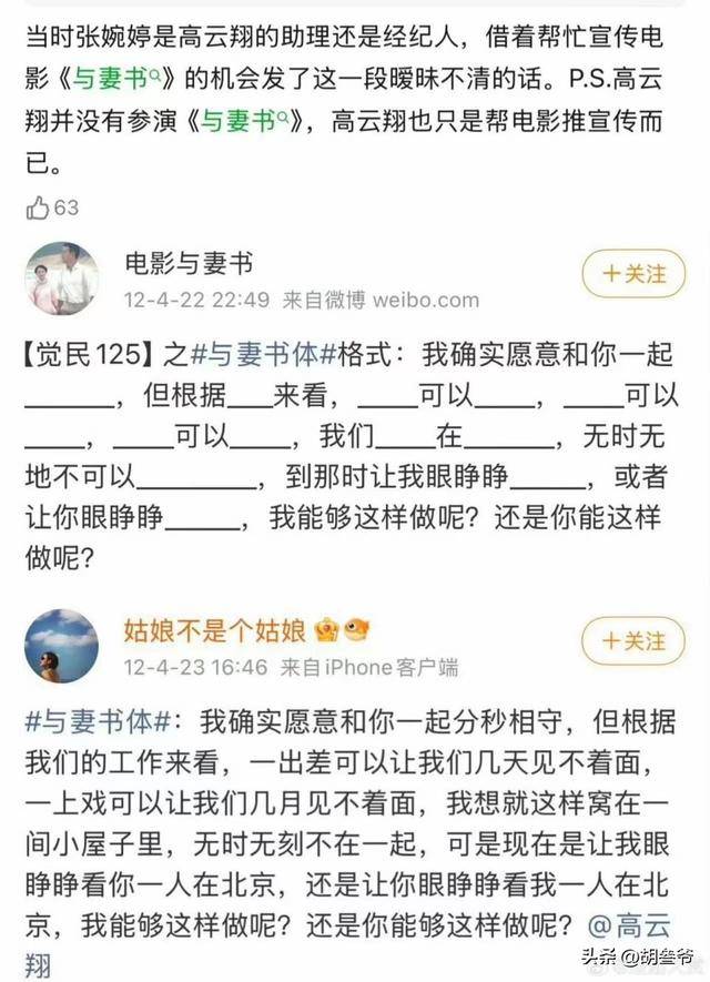 2012年4月,张婉婷在社交账号发了一段模仿电影《与妻书》的情书体文案,直接@高云翔,字里行间全是“分秒相守”“无时无刻不在一起”的暧昧话。
