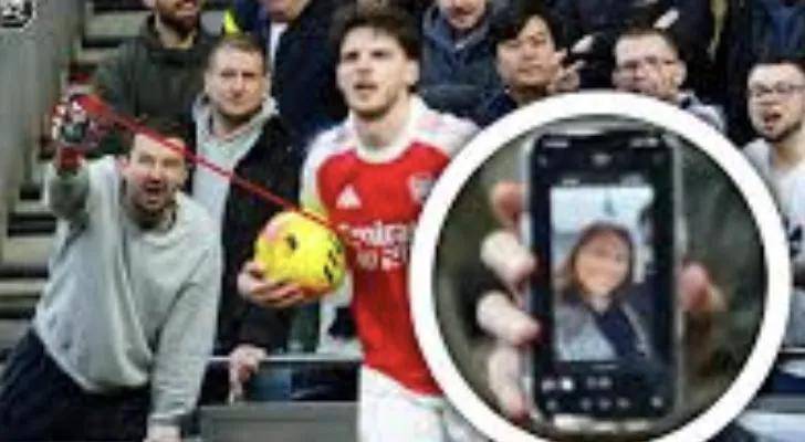 更可怕的是,有人居然把这种没由来的攻击和仇恨带到了线下。在一场阿森纳对切尔西的晚间比赛中,德克兰正在切尔西球迷看台正前方准备主罚,切尔西队的一名男粉丝就在观众席举着手机,手机上显示着劳伦的照片。