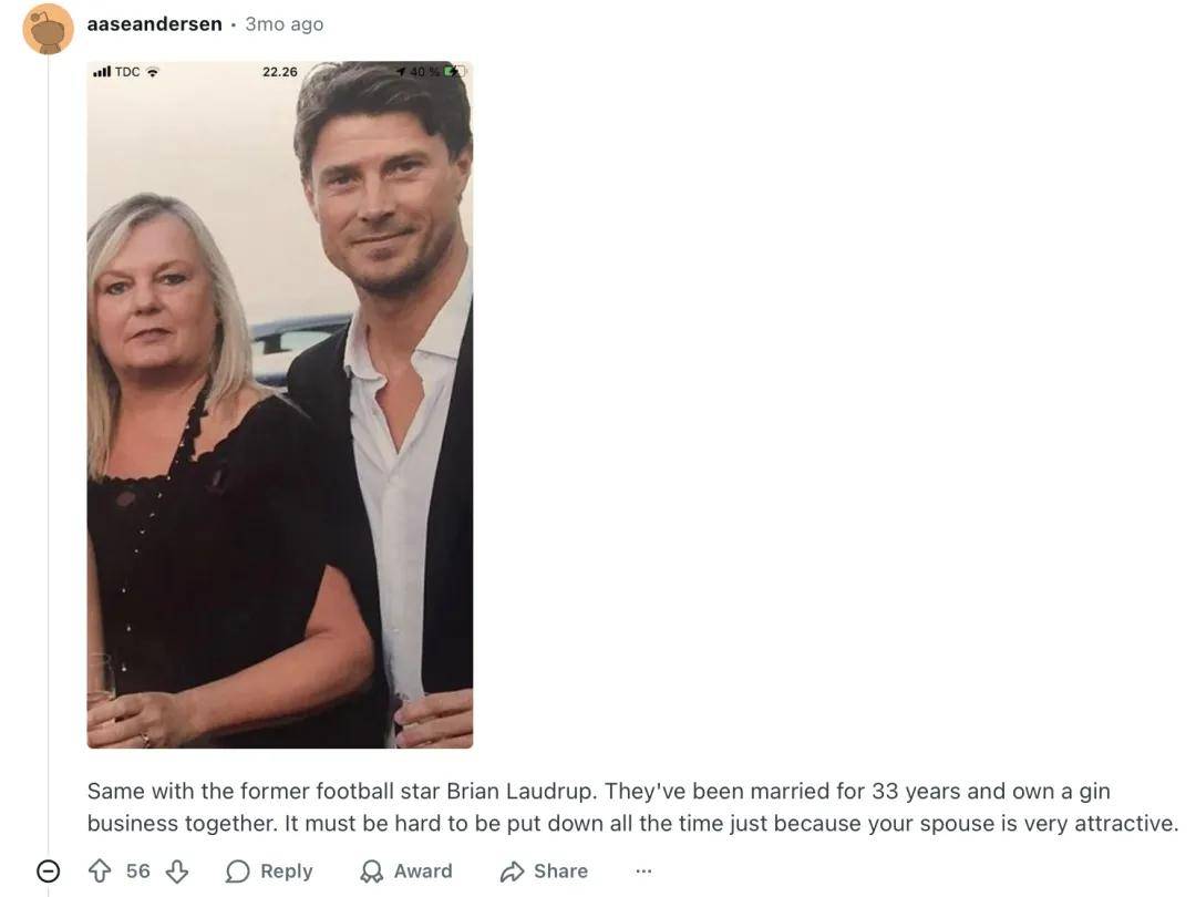 “前足球巨星布莱恩·劳德鲁普(Brian Laudrup)的情况也如出一辙。他们结婚已达33年之久,还共同经营着一家金酒(Gin)生意。