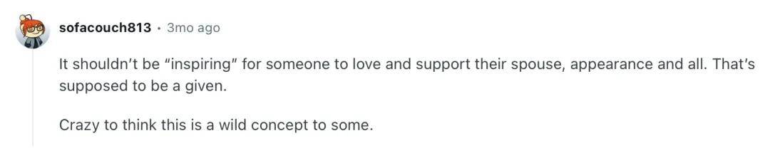 “一个人全心全意地爱着并支持自己的伴侣——无论对方外表如何——这本不该被视为某种‘励志’的壮举。这理应是伴侣之间最基本、最自然不过的常态。
