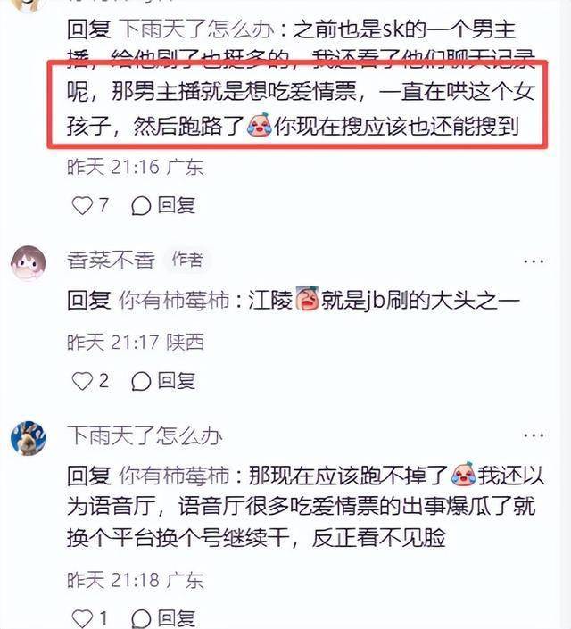 另一位男主播江陵则比她还更过分,他曾经直接在直播间里举起写有女生名字的横幅,据说还在有女朋友的情况下,哄着女生谈恋爱,给他刷爱情票呢。