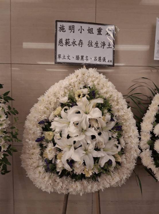 灵堂门口放置一本吊唁册,印有施明回眸一笑的样子,灵堂内放满花圈,包括有古天乐、演艺人协会;灵堂的花圈有电视广播有限公司、杨明和庄思明、谭玉瑛、唐韦琪等。