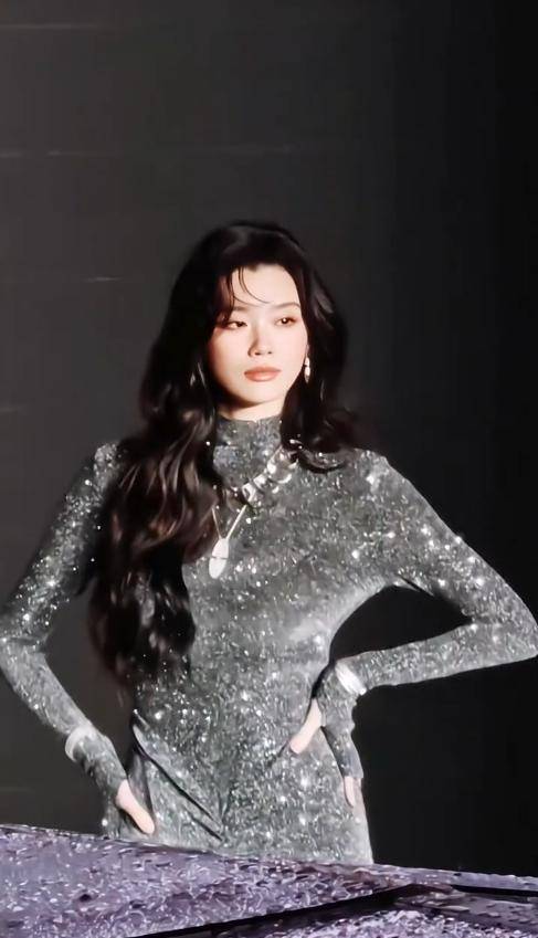 当天她穿了一条全裹式的银灰色亮片包臀裙,这条裙子从脖子一直裹到脚踝,没有一点露肤设计。