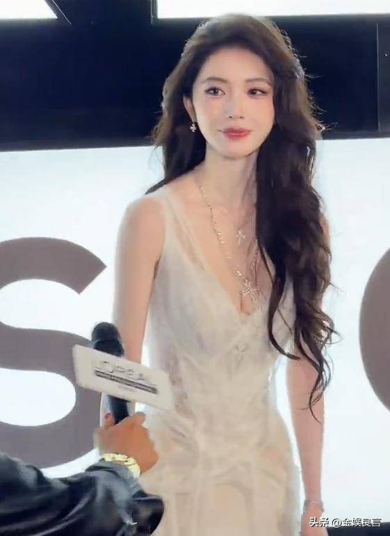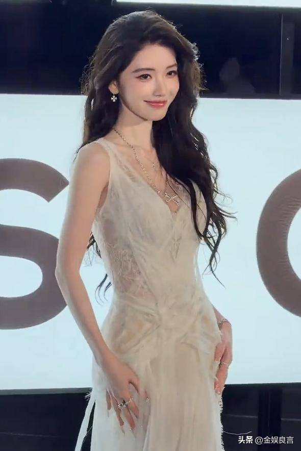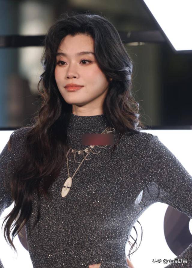 当天上海飘着细雨,秀场灯光打在红毯上,氛围感直接拉满,奚梦瑶一身银灰碎钻长裙亮相,178cm的身高把版型撑得利落又舒展。