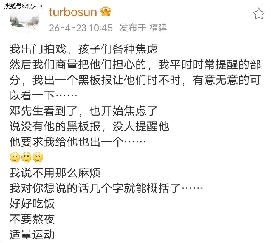 面对老公的撒娇,孙俪无奈又宠溺,只写了三句简单又实在的叮嘱:“好好吃饭,不要熬夜,适量运动”。