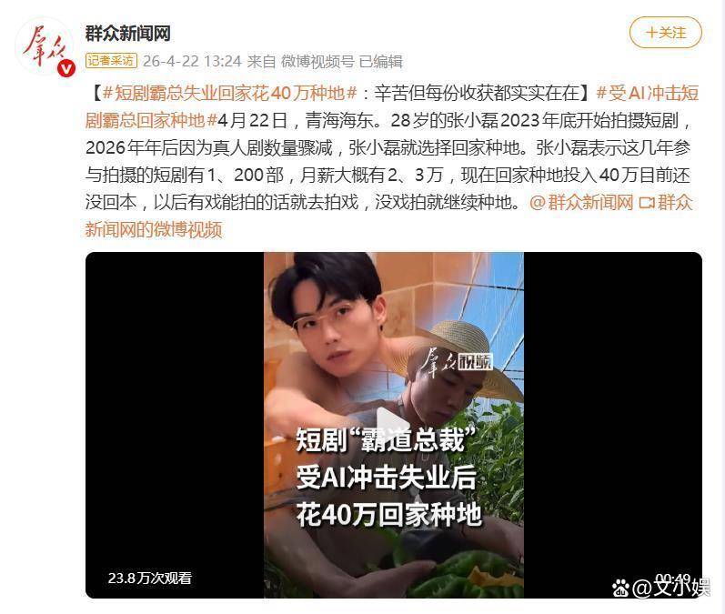 据媒体和网友爆料:在青海的海东田埂上,28岁的张小磊扛着锄头的画面,与几个月前他在短剧里饰演的“霸总”形象形成了魔幻对比。这位因AI冲击而失业的短剧演员,如今投入40万种地尚未回本,一句“有戏拍戏,没戏种地”的淡定表态,却意外戳中了2026年影视行业变天的痛点。