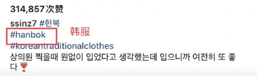 不仅如此,还在评论区特意添加了“韩服”、 “韩国传统服饰”等标签,颇有些刻意挑事的嫌疑。