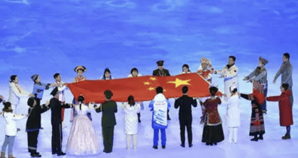 2022年2月4日,北京冬奥会开幕式上,56个民族代表依次传递国旗。