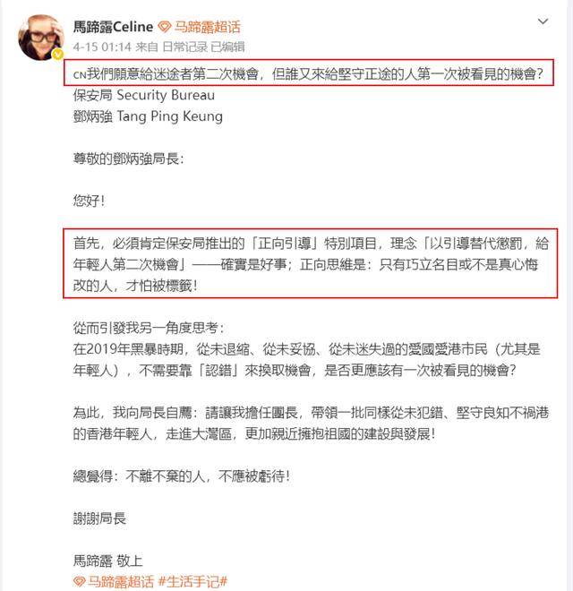 可网友们哪会买他的账啊!大家纷纷抵制,网上骂声一片。就在这时候,马蹄露站出来了。她直接给香港保安局局长邓炳强写了一封公开信,自荐担任交流团团长。信里有一句话特别戳心,她说:“我们愿意给迷途者第二次机会,但谁又来给坚持正途的人第一次被看见的机会?”这话一出来,网友们瞬间沸腾了,纷纷为马蹄露点赞。
