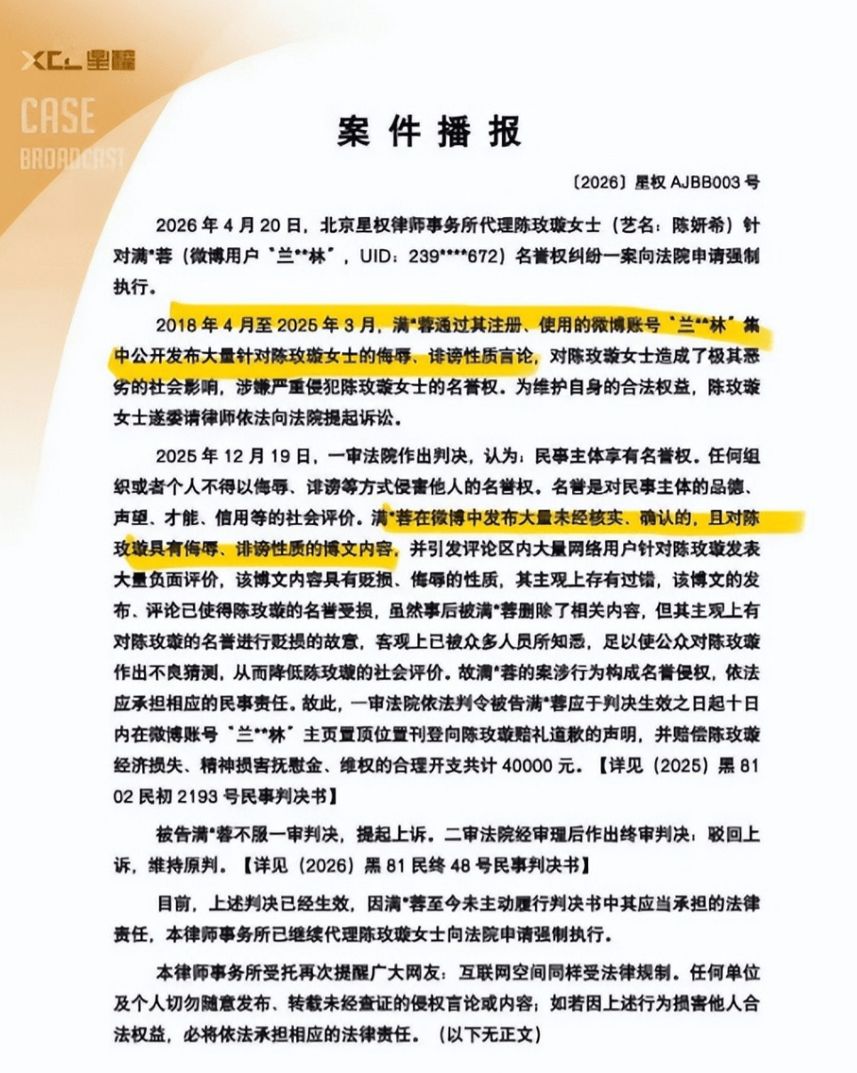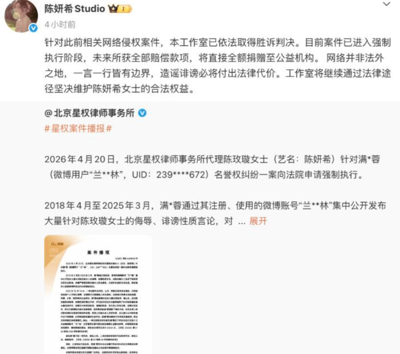 陈妍希一直忍到2025年离婚,到了2026年4月才申请法院强制执行,法院判下来赔4万。
