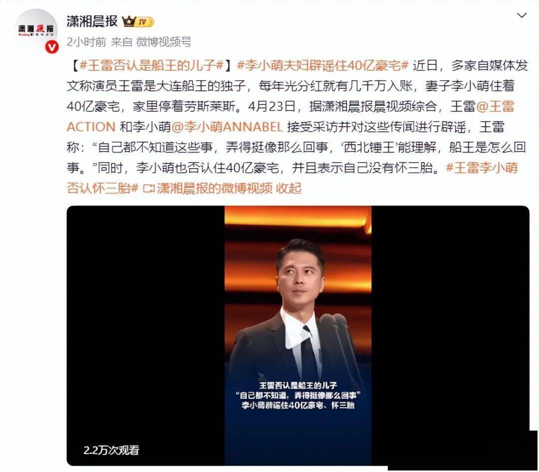 (来源:潇湘晨报)近日,多家自媒体发文称演员王雷是大连船王的独子,每年光分红就有几千万入账,妻子李小萌住着40亿豪宅,家里停着劳斯莱斯。4月23日,据潇湘晨报晨视频综合,王雷和李小萌