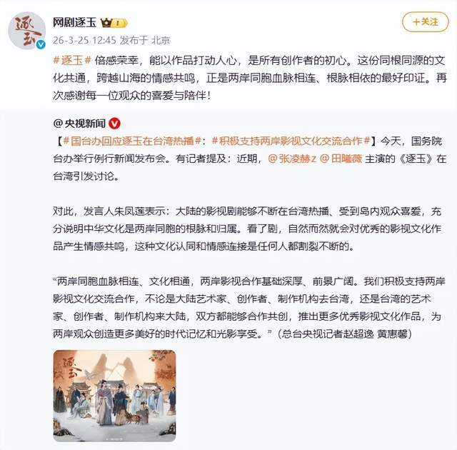 这用心的创作最终收获了实实在在的回响。《逐玉》在台湾播出后,连续14天蝉联播放平台热度冠军,数据背后是台湾观众对这部大陆古装剧由衷的认可。更引人关注的是,当地青年甚至通过国民党主席郑丽文向张凌赫喊话:“只要张凌赫来台湾就好。”一句直白的欢迎,足见这部剧在年轻人群体中的破圈效应。