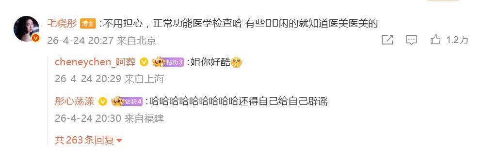 面对大家的关心和疑问,她还在评论区补充说明,自己去诊所是进行“正常功能医学检查”,让大家不用担心,别想多了。