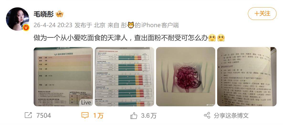 报告显示,她对小麦面粉属于“重度6级不耐受”,意味着需要停止食用6个月。对于一个从小吃面食长大的天津姑娘来说,这简直比“塌房”还让人崩溃。