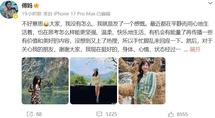 舆论发酵不过数小时,傅首尔本人火速下场回应。她晒出几张近照,配文语气坦然:“我没有怎么,我就是发了一个感慨。我现在挺好的,身体、心情、状态经过一段时间调整,都有改变。还没有新感情。”