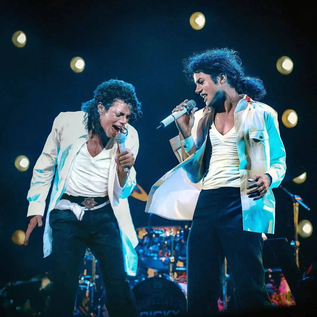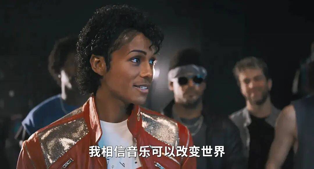 由MJ的侄子贾法尔·杰克逊扮演的MJ本人,正在台上奋力表演。从装扮、样貌、身材、表情等等细节来看,贾法尔·杰克逊对MJ做出了神还原。
