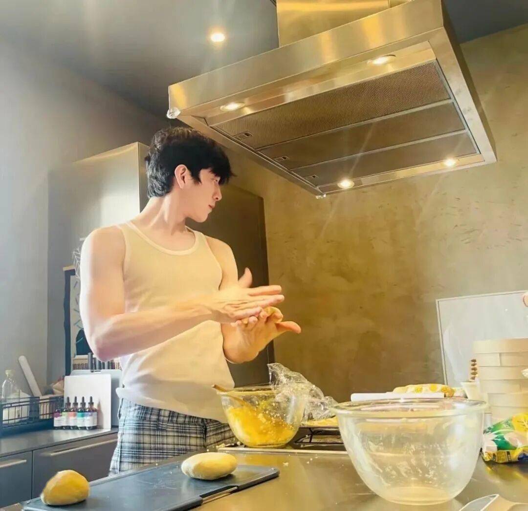 把他放在厨房好合适,系上围裙,卷起袖子露出一截小臂做菜。