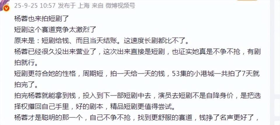 无论是短剧还是长剧,只要还能在行业里拍戏,对于向来不争不抢的杨蓉已足够了,加上短剧拍摄周期短、结账时间快,而且自身演技过关,拍摄轻车熟路。