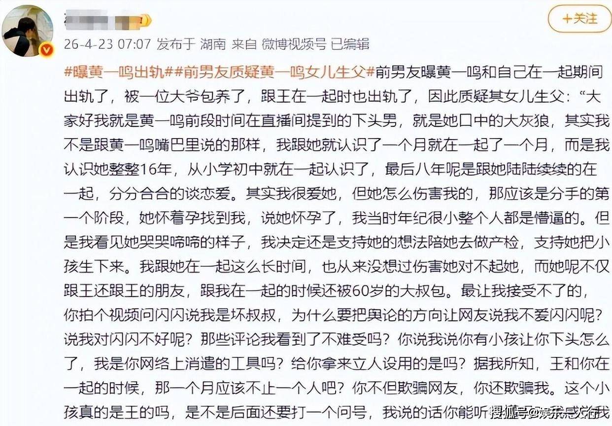 他在视频结尾放了狠话:所有言论全部属实,愿意接受司法机关核查,承担一切法律责任。他直接向黄一鸣喊话,要求去做亲子鉴定,以确定孩子的亲生父亲到底是谁。
