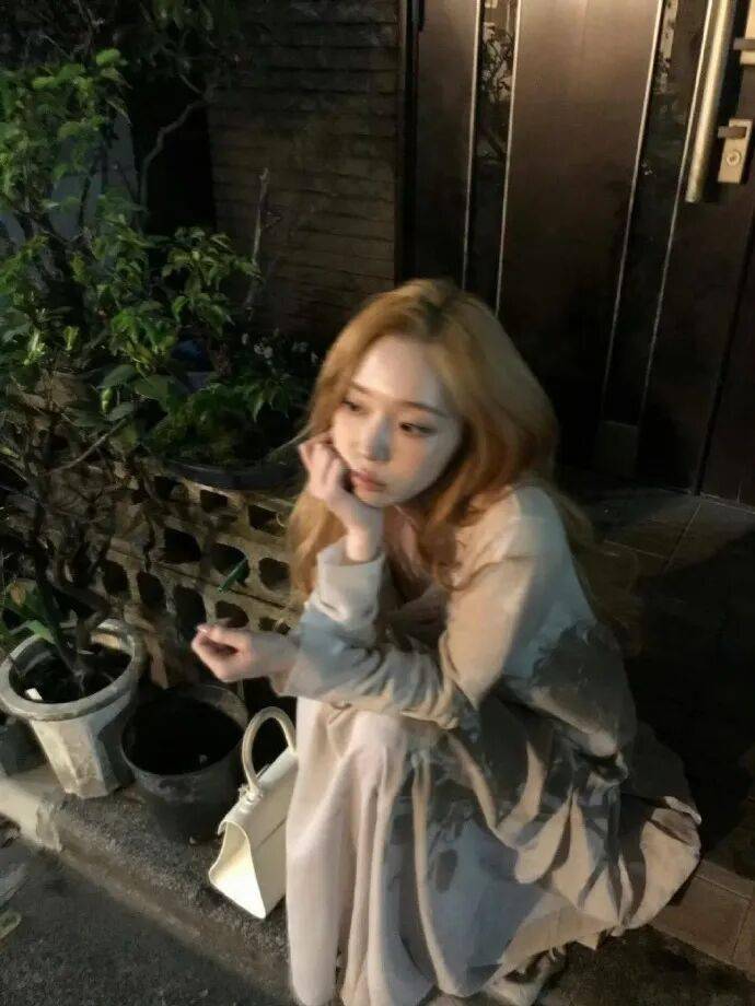照片中,Winter随意地坐在一栋建筑的台阶上,身旁是盆栽,身后是一扇清晰可见的私人门扉。