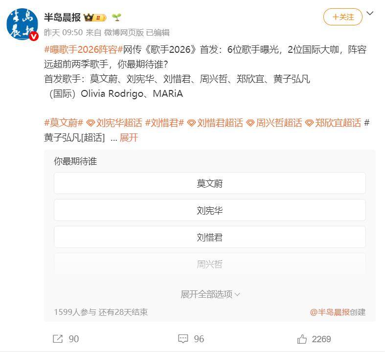 近日,网上传出《歌手2026》阵容已经确定,根据知情人士透露,当红流量小生要来踢馆,对方的热度要比“马嘉祺”还高,大家期待吗?