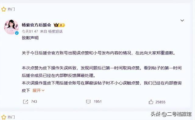 4月14号,她的官方后援会误点赞了一条质疑她停工是因为怀孕的博文,15号凌晨才发道歉,说是工作人员屏蔽帖子时手滑,还说开除了涉事人员。
