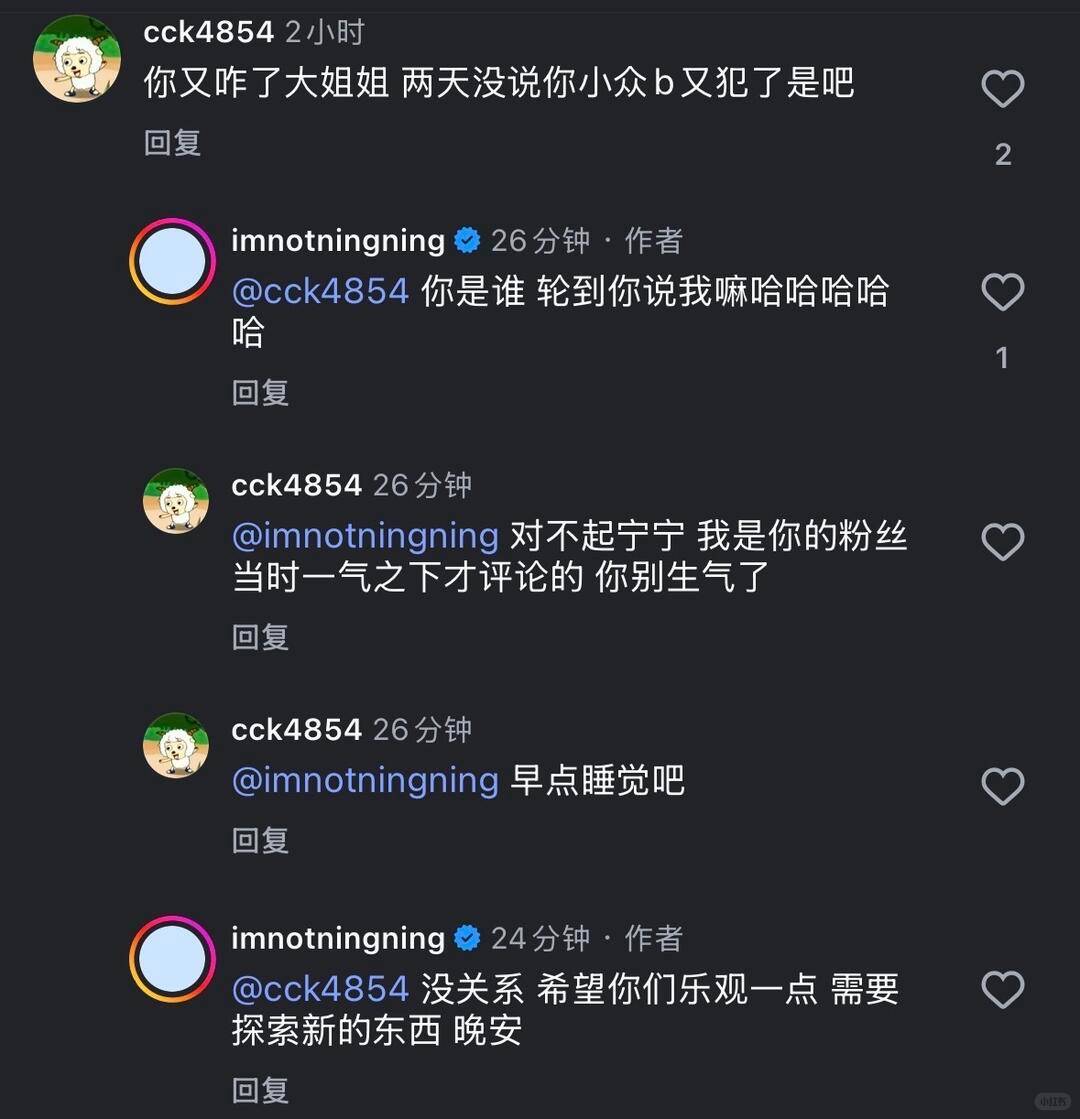 而宁艺卓在确认对方的伪装后,态度立刻转为温和,回复了 “没关系”“晚安”。