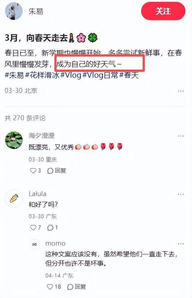 不过看朱易现在的状态,她疑似已经从之前那种悲伤赌气的氛围中走了出来,发了很多岁月静好的动态。