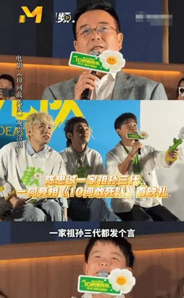 近日,陈思诚在宣传新作《10间敢死队》时,他的父亲和儿子朵朵也现身当天的首映礼。在发言时祖孙三代同框的画面,让大家不禁感叹三人眉眼轮廓高度相似,共用一张脸。