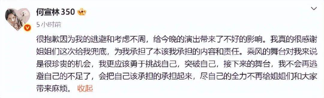 25日凌晨,何宣林发文道歉,表示很抱歉因为自己的逃避和考虑不周,给演出带来了不好的影响。何宣林称:“我真的很感谢姐姐们这次给我兜底,为我承担了本该我承担的内容和责任。”