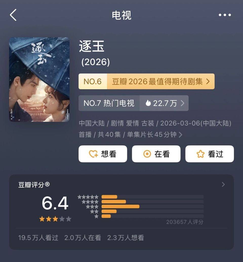 从各项数据来看,《逐玉》确实符合大爆剧的标准,开播没几天平台热度就突破三万,剧集播放量也很亮眼,两位主演更是有承包热搜之势。