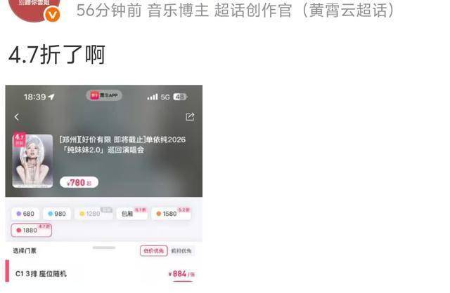 可她这种表面上的松弛也难掩颓势,风波后的郑州演唱会卖票一周没卖完,打折越打越凶,从8折降到6折,再一路降到半价。
