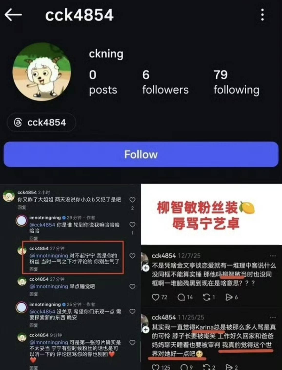吒学又有新剧情了! 4月26日,aespa中国成员宁艺卓在Instagram评论区直接"下场",对长期骚扰的黑粉"重拳出击",同时对温柔粉丝"区别对待",这波操作直接把全网炸开了锅 。事情是这样